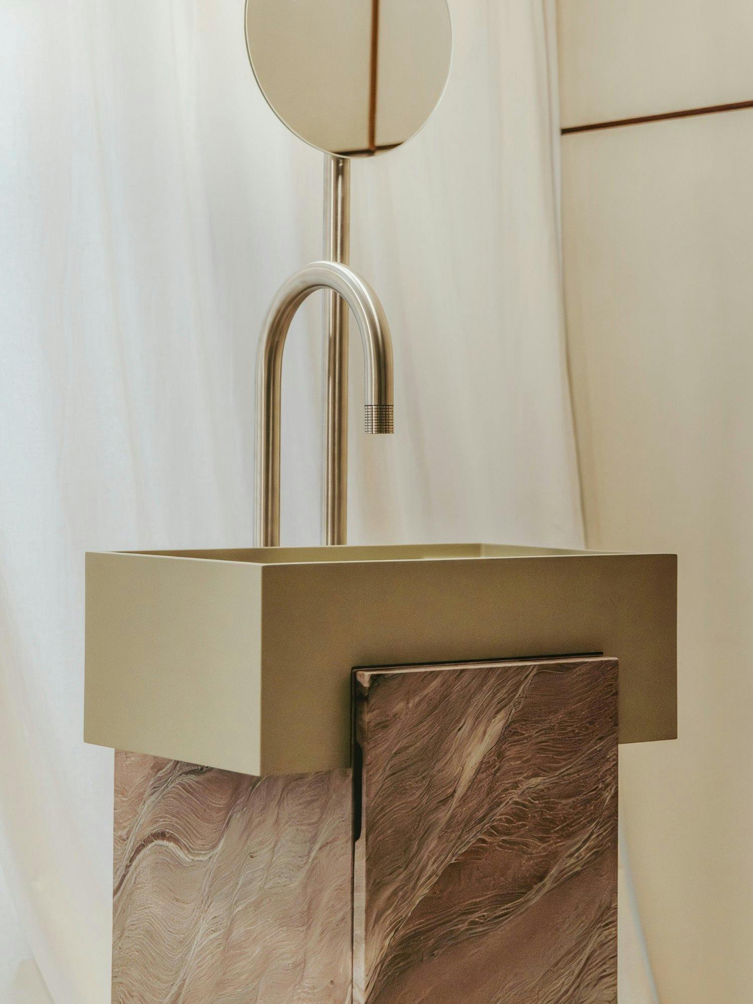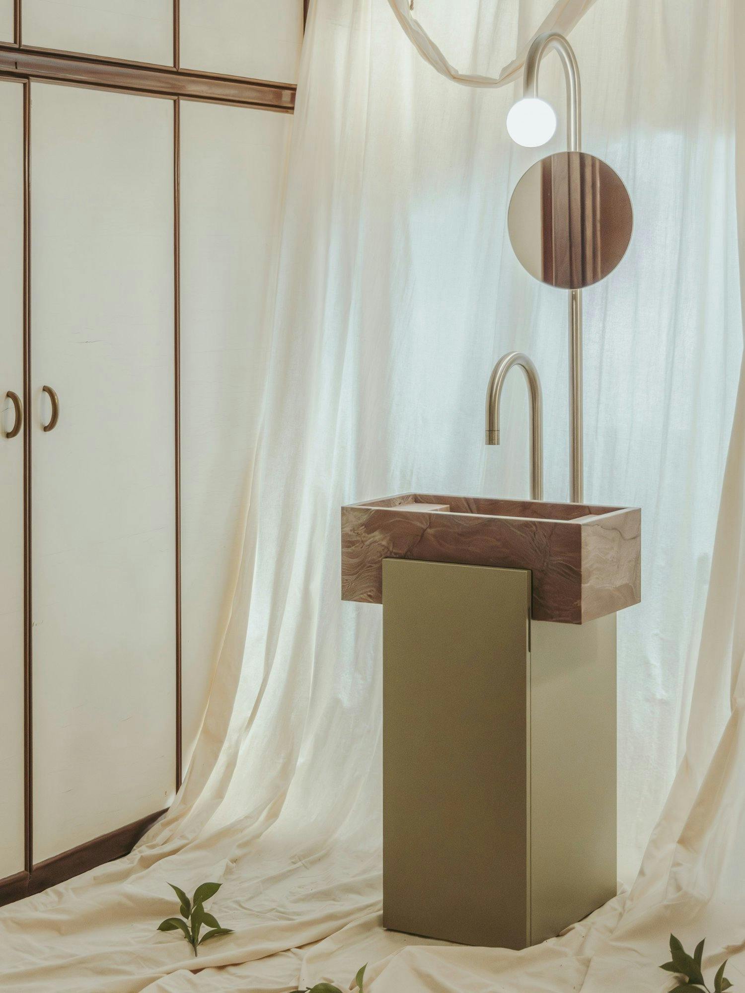 The exhibition in the former party and billiard cellar of Villa Borsani in Varedo was dedicated to the MILANO TABLE LAMP and the TIORE washbasin. Draped in canvas that concealed more than it revealed, the setting evoked the thrill of unearthing forgotten treasures in a basement full of secrets.