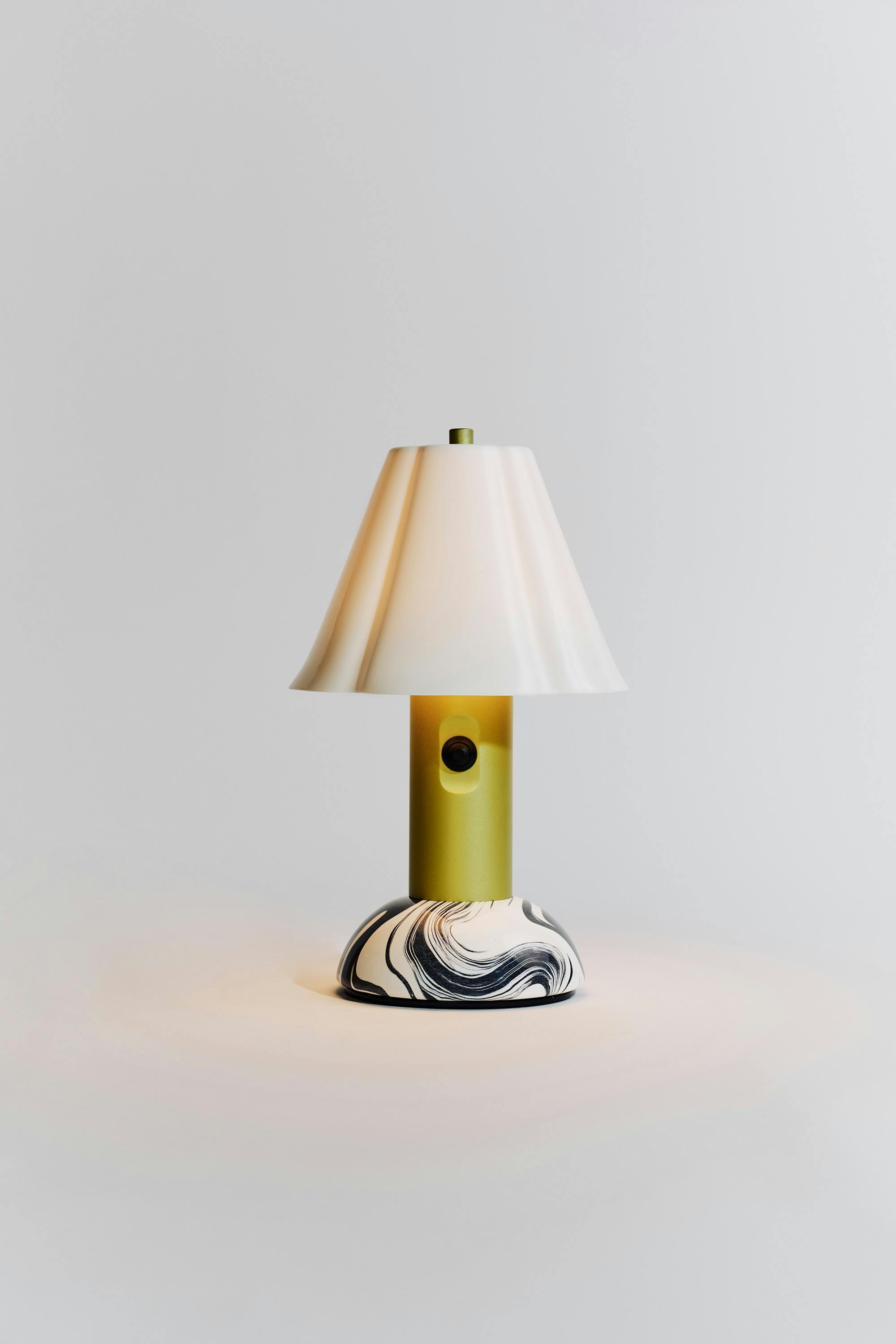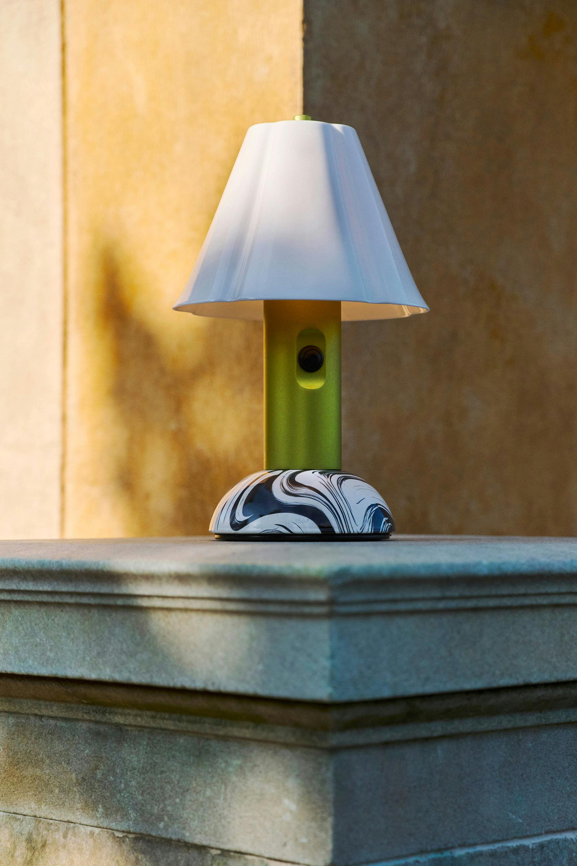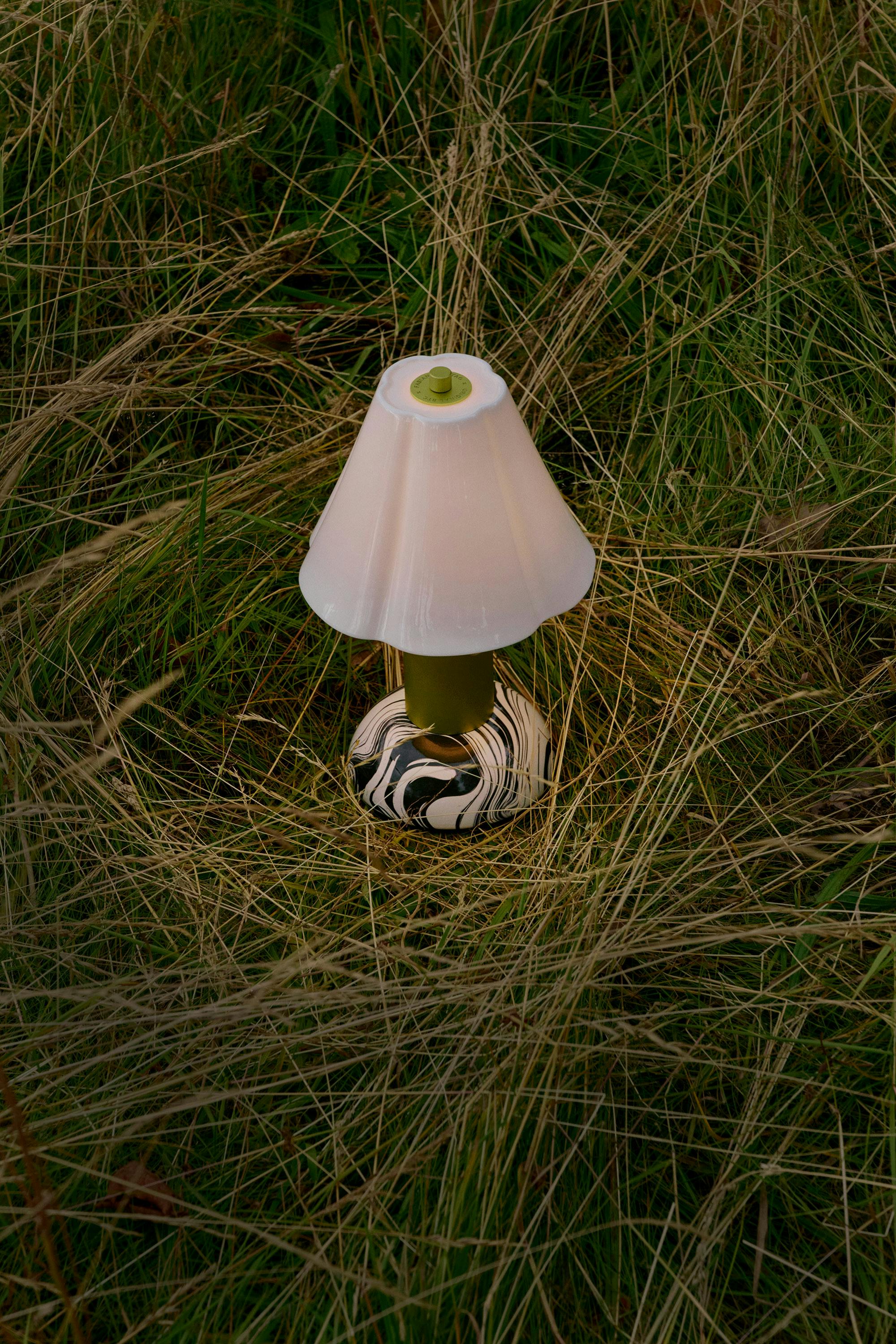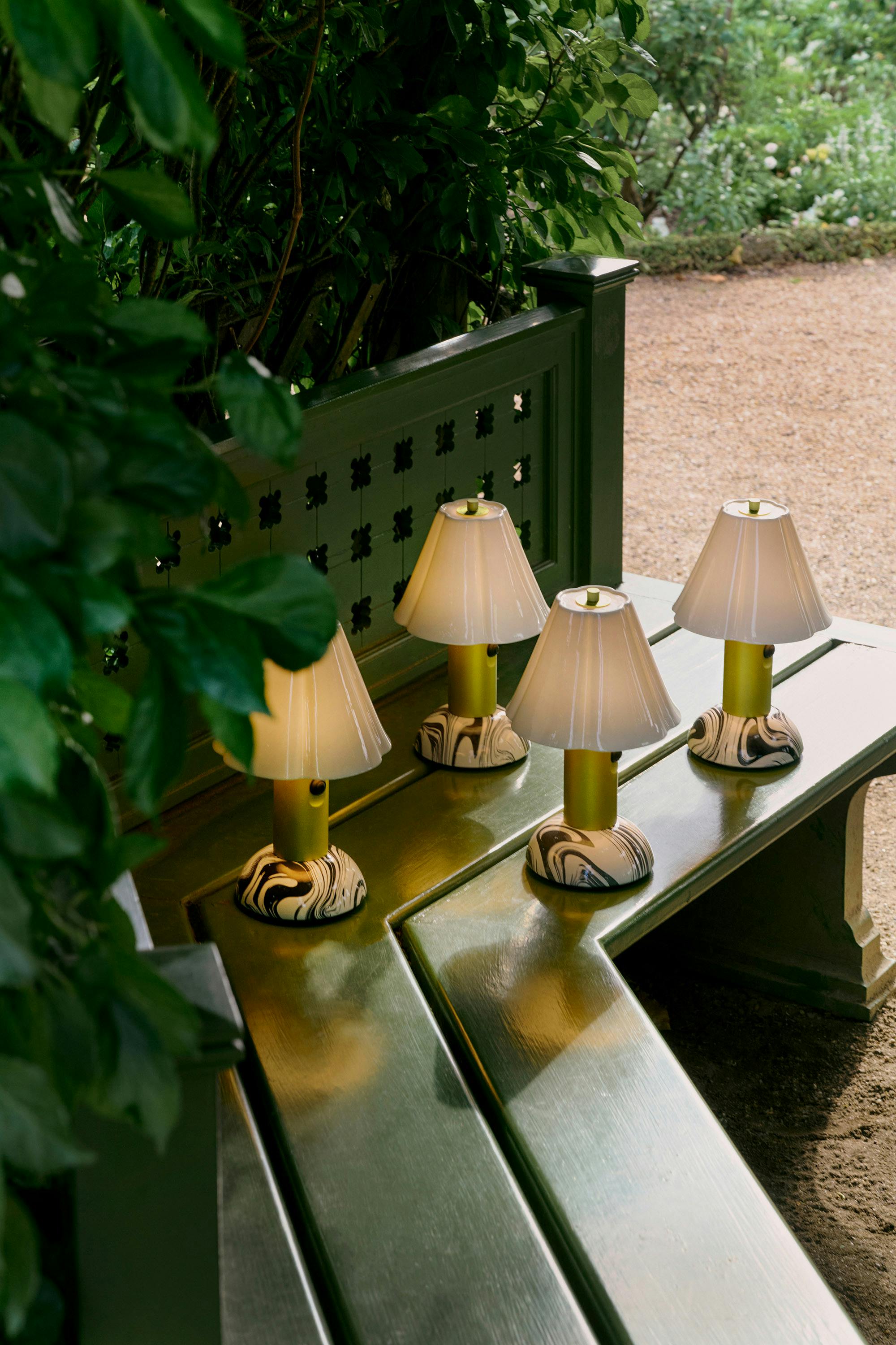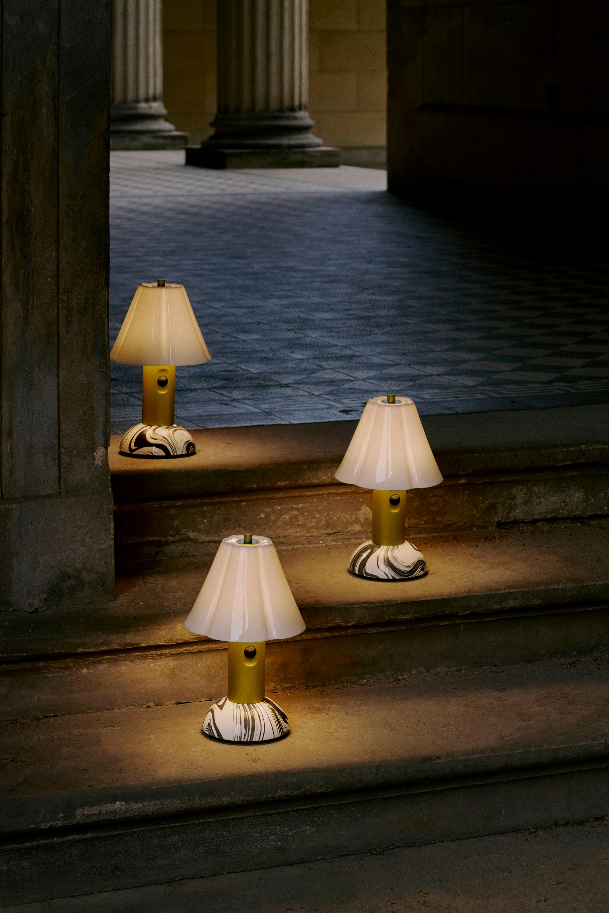 The idea behind the light was to create a portable object for an imaginary Hollywood Regency garden party – a setting defined by glamour, nostalgia and eccentric elegance. To bring this vision to life, the design features anodised finishes and hydro dipping, adding extraordinary depth and texture to the surface.